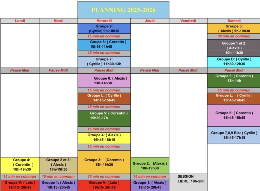 Vous trouverez ci-dessous le planning des entrainements de la saison 2024/2025 Si vous ne connaissez pas votre groupe, adressez-vous aux entraineurs Planning vacances été 2025 Planning vacances scolaire (6)Télécharger
